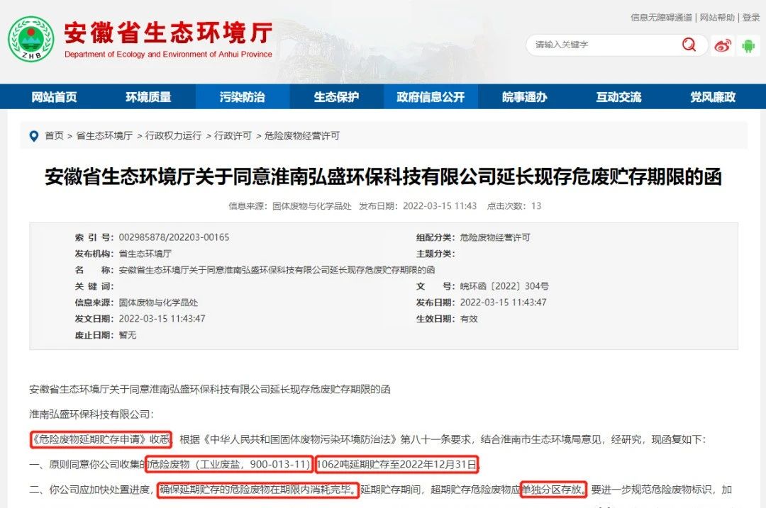 安徽省生態(tài)環(huán)境廳關于同意淮南弘盛環(huán)??萍加邢薰狙娱L現存危廢貯存期限的函 《危險廢物延期貯存申請》收悉。根據《中華人民共和國固體廢物污染環(huán)境防治法》第八十一條要求,結合淮南市生態(tài)環(huán)境局意見,經研究,現函復如下: