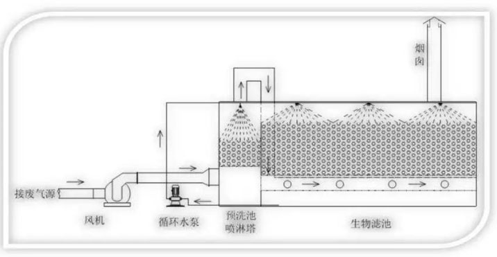 1、生物過濾工藝核心單元為預洗滌和生物濾床兩部分,預洗滌通過循環(huán)泵,以水為循環(huán)介質(zhì),噴淋填料層,吸收氣體中的可溶性成分,同時對氣體起加濕作用。生物濾床是生物過濾的主體,微生物在生物填料表面形成生物膜,對氣體中的污染物成分進行吸附降解,生物濾床上部裝有噴淋頭,對床層間歇式噴淋,給生物濾床提供生物所必需的水分,同時沖洗微生物代謝產(chǎn)生的硫酸鹽、硝酸鹽,以及生物膜老化產(chǎn)生的殘骸,保證生物膜的活性。設備單機和聯(lián)機調(diào)試正常后,就開始生物掛膜和菌種培養(yǎng)。